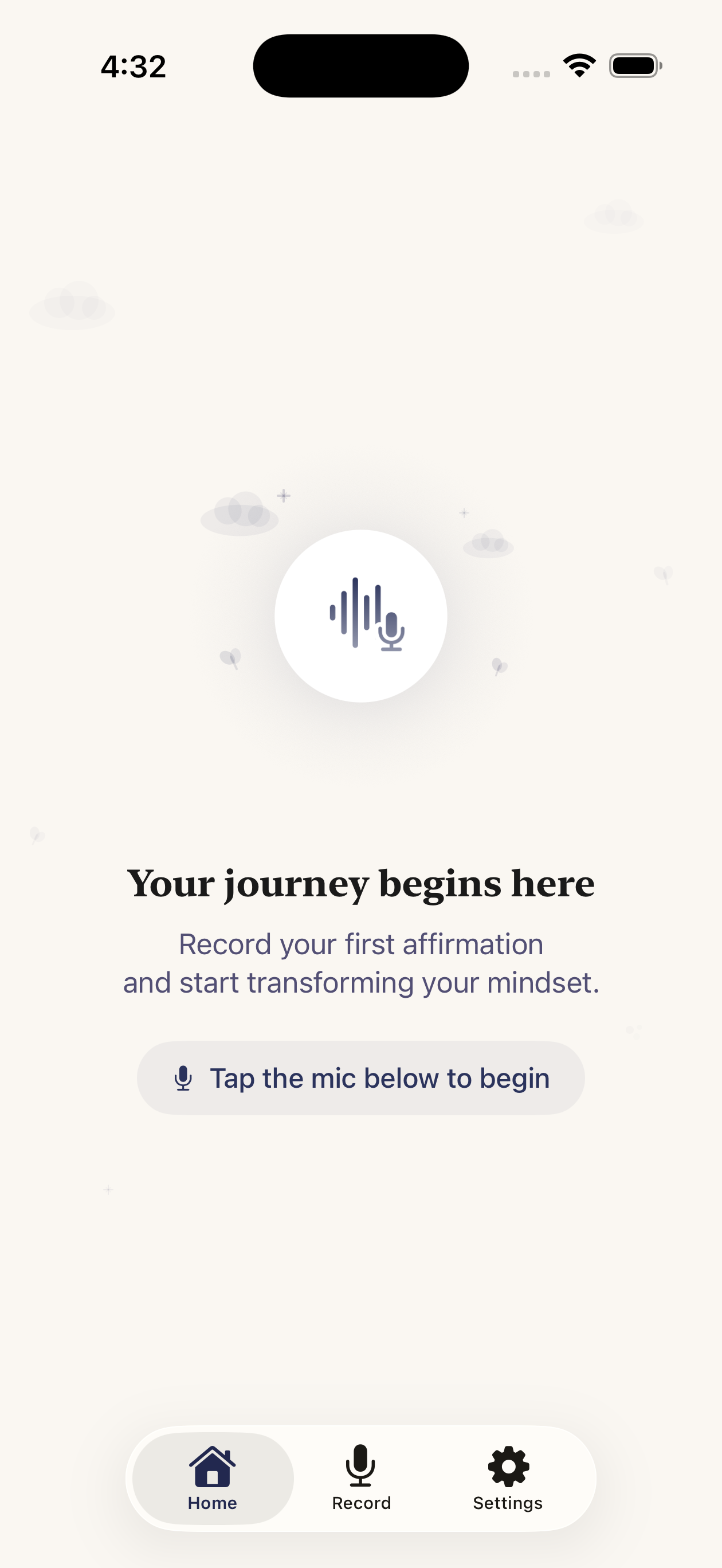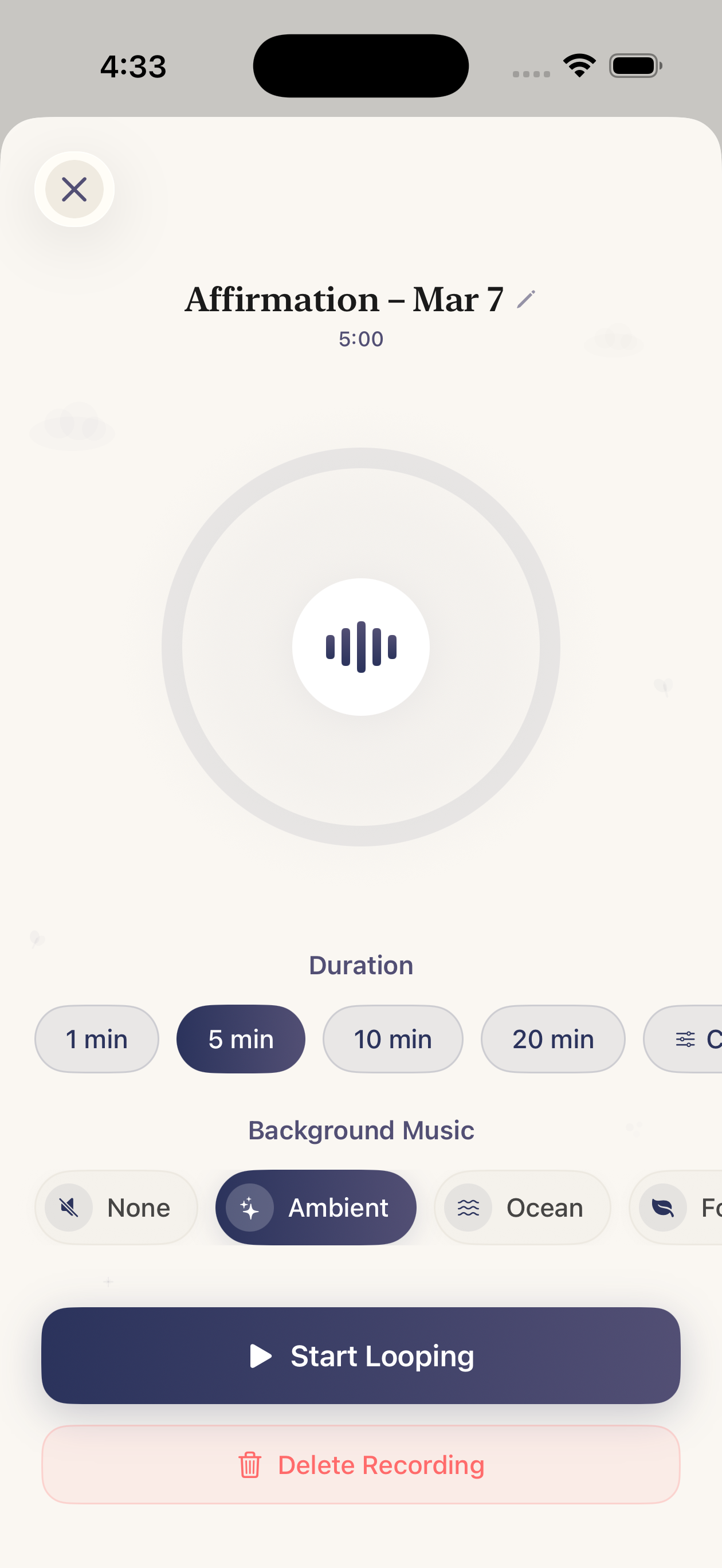 Record affirmations in your own voice and loop them with calming background music. Hear yourself speak your truth — every single day.