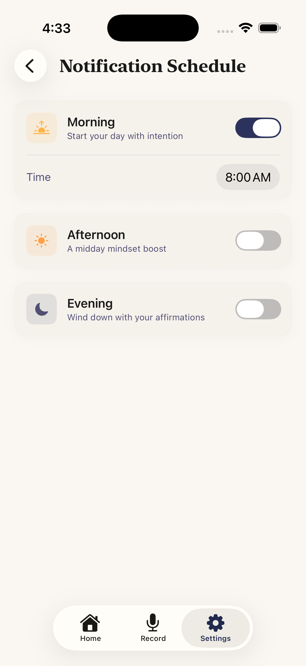Set up morning, afternoon, and evening nudges so your practice becomes a habit. Consistency is what rewires the mind.